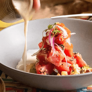 - Tiradito de Atún en salsa de maracuyá ahumada.